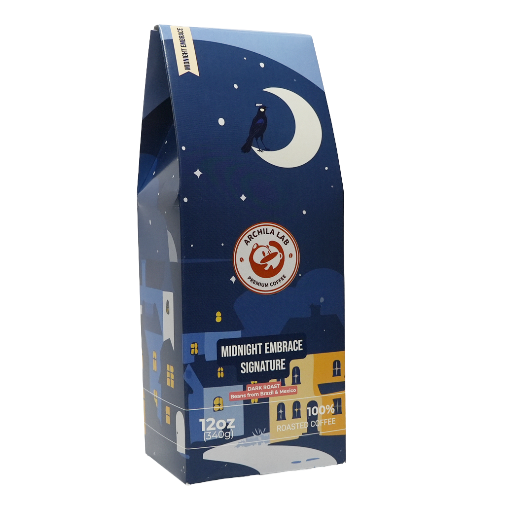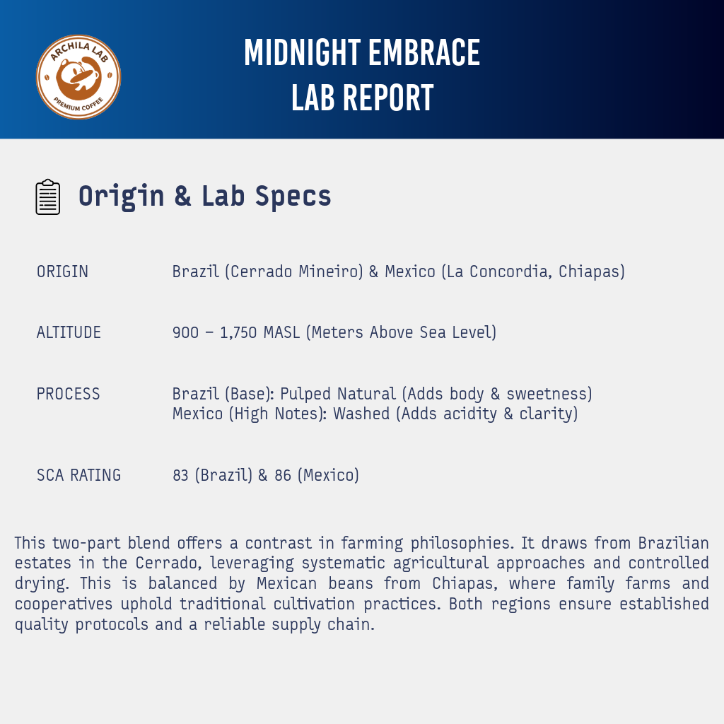"Midnight Embrace" is a study in viscosity. We engineered this profile for texture, fusing the heavy, structural body of Brazilian beans with the nutty refinement of Mexican Arabica.